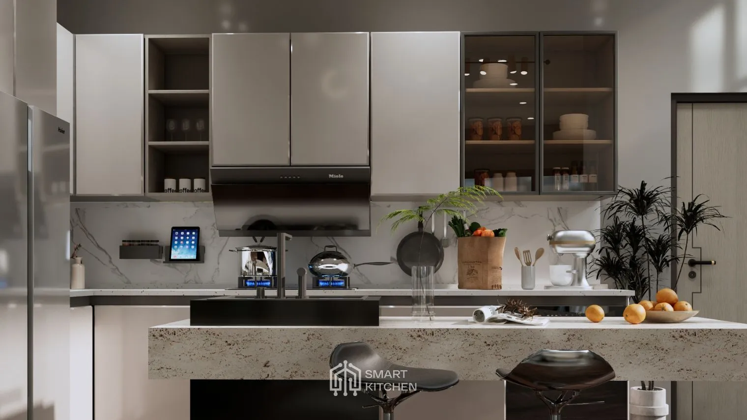 Kitchen set modern ini dirancang dengan garis bersih, material elegan, dan tata ruang efisien. Sentuhan marble pada backsplash dan island table menambah kesan mewah, sementara kabinet glossy menghadirkan nuansa kontemporer yang berkelas. Dapur ini tidak hanya indah dipandang, tapi juga mendukung aktivitas memasak sehari-hari dengan sistem penyimpanan rapi dan peralatan built-in modern.